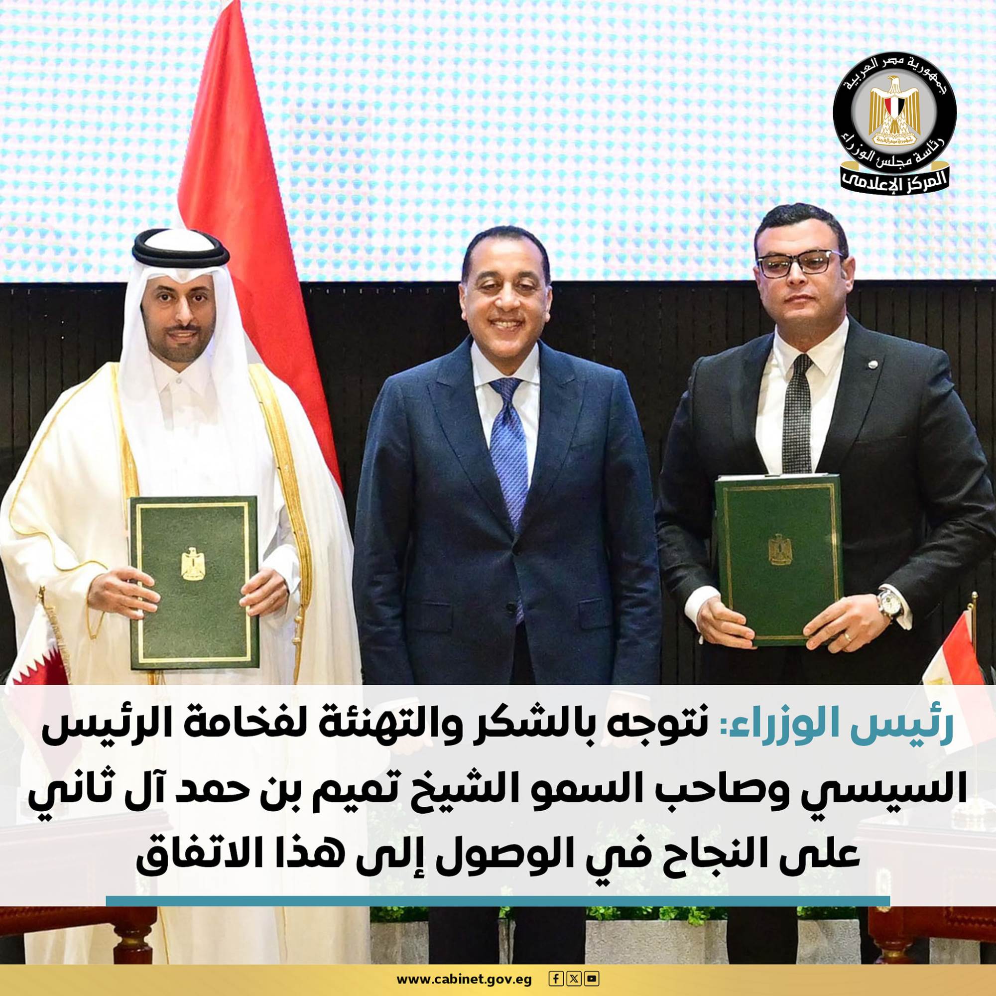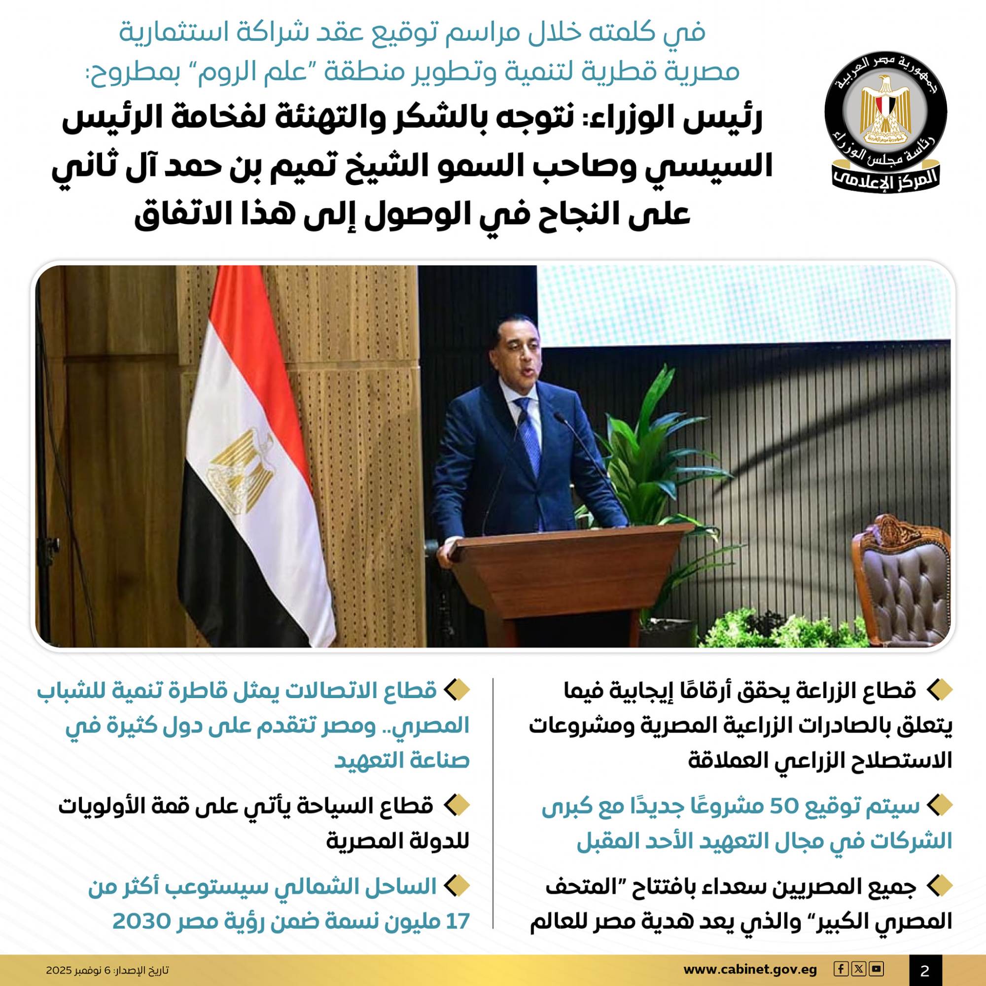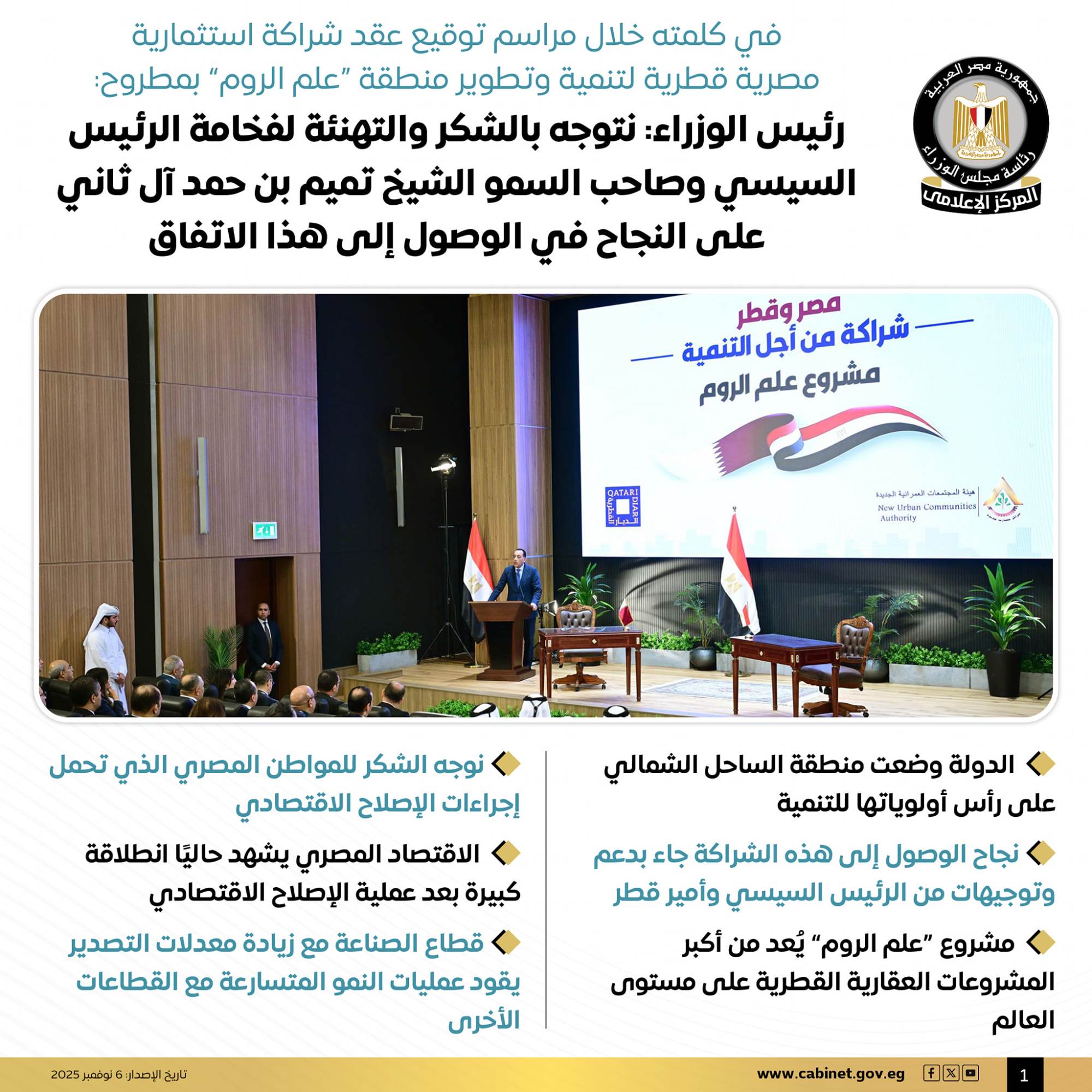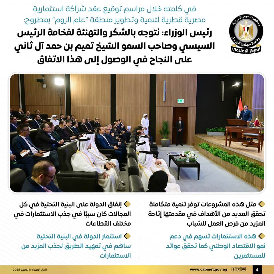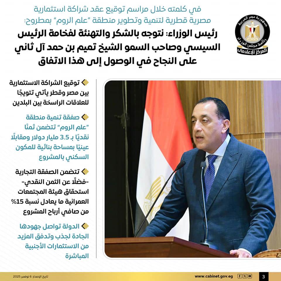 نشرت رئاسة مجلس الوزراء المصري عبر صفحتها الرسمية على موقع التواصل الاجتماعي فيسبوك اليوم الخميس، عددًا من الانفوجرافات تتضمن التفاصيل الكاملة لمراسم توقيع عقد شراكة استثمارية مصرية قطرية لتنمية وتطوير منطقة "علم الروم" بمطروح.