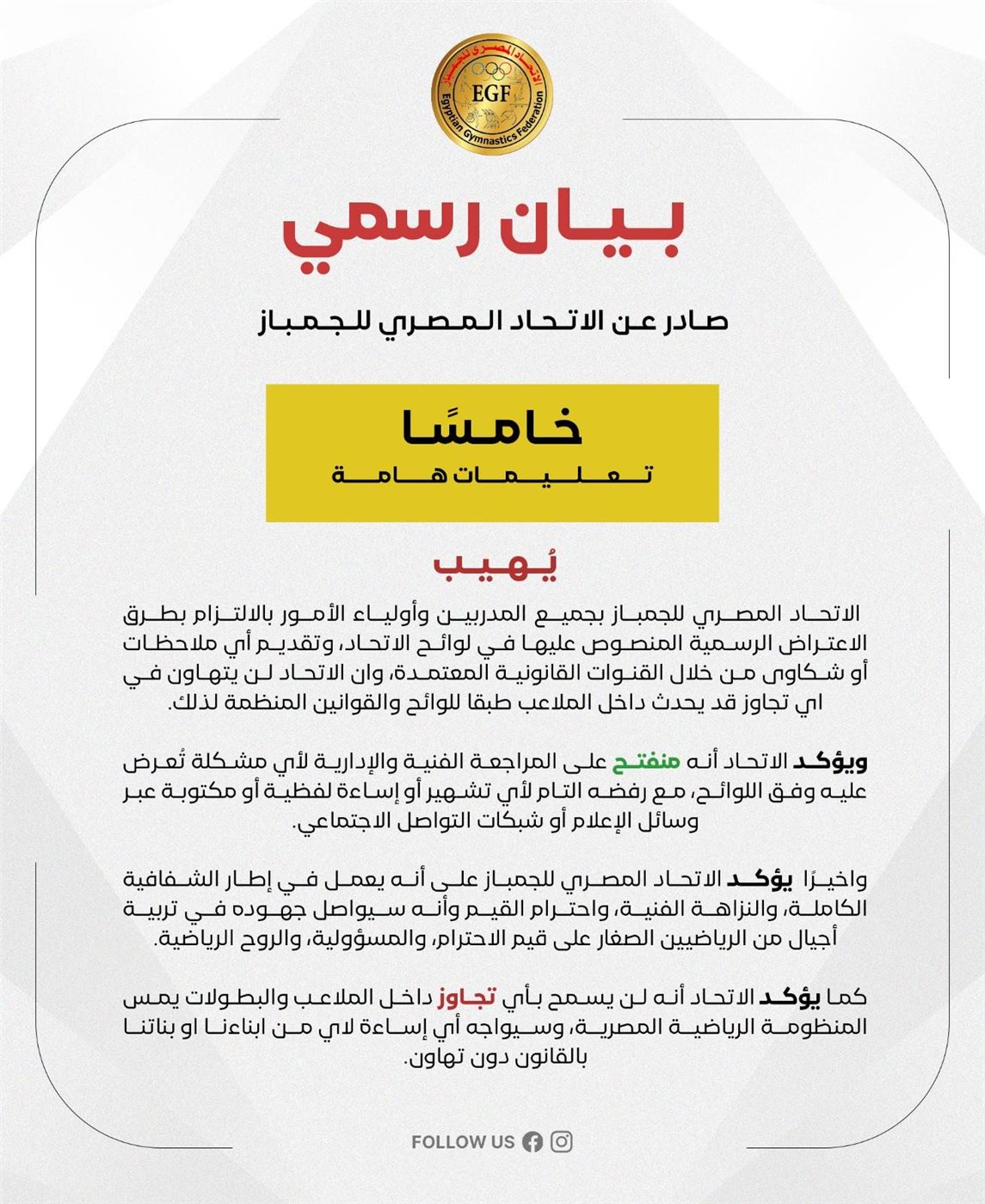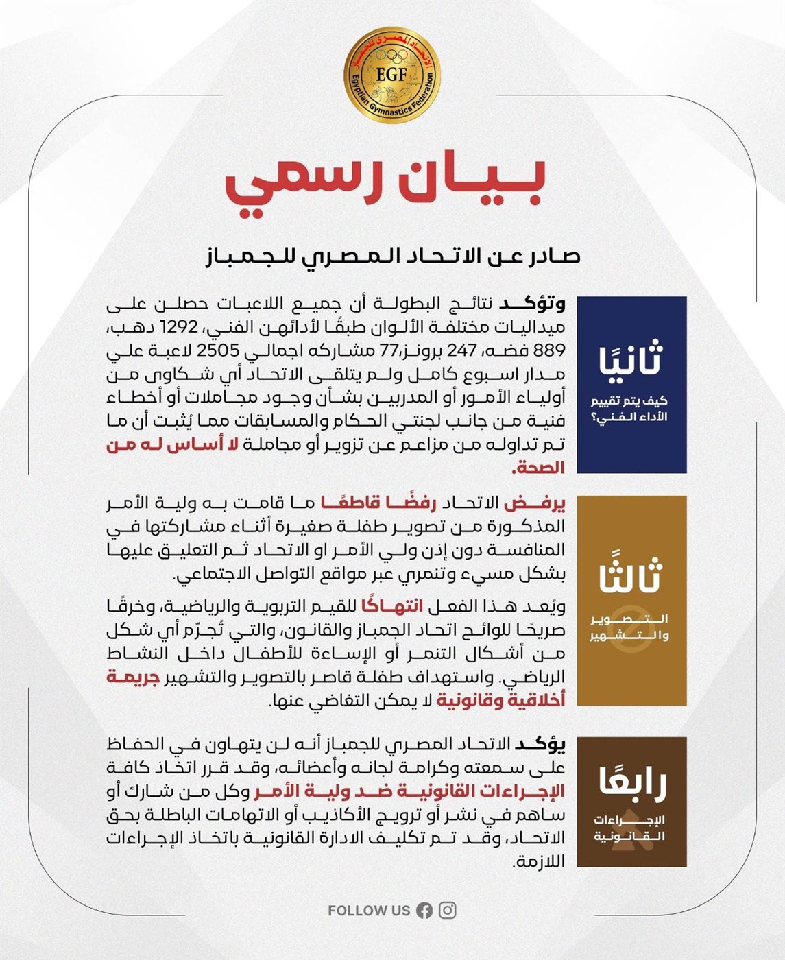 يؤكد الاتحاد المصري للجمباز أنه لن يتهاون في الحفاظ على سمعته وكرامة لجانه وأعضائه، وقد قرر اتخاذ كافة الإجراءات القانونية ضد السيدة المذكورة وكل من شارك أو ساهم في نشر أو ترويج الأكاذيب أو الاتهامات الباطلة بحق الاتحاد.