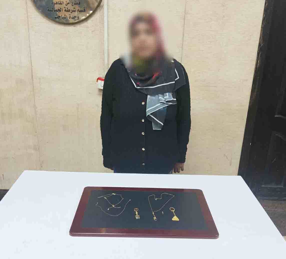 كما تم ضبط (إحدى السيدات) بدائرة قسم شرطة الجمالية لقيامها بسرقة مشغولات ذهبية من داخل مسكن "محل عملها" بأسلوب "المغافلة" ، وبحوزتها (المشغولات الذهبية المستولى عليها).