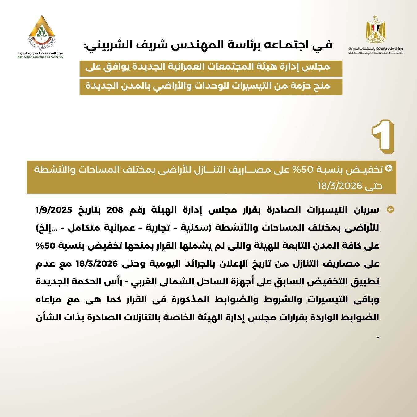 تضمنت الموافقة على سريان التيسيرات الصادرة بقرار مجلس إدارة الهيئة رقم 208 بتاريخ 1/9/2025 للأراضى بمختلف المساحات والأنشطة (سكنية – تجارية – عمرانية متكامل - ...إلخ) على كافة المدن التابعة للهيئة والتي لم يشملها القرار بمنحها تخفيض بنسبة 50% على مصاريف التنازل من تاريخ الإعلان بالجرائد اليومية وحتى 18/3/2026 مع عدم تطبيق التخفيض السابق على أجهزة الساحل الشمالى الغربي – رأس الحكمة الجديدة وباقى التيسيرات والشروط والضوابط المذكورة فى القرار كما هى مع مراعاه الضوابط الواردة بقرارات مجلس إدارة الهيئة الخاصة بالتنازلات الصادرة بذات الشأن .