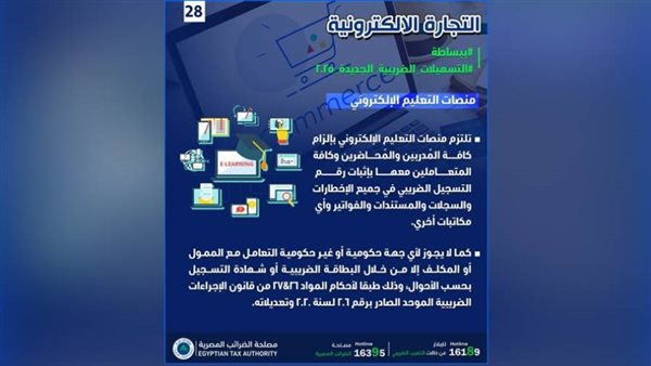وأوضح الإنفوجراف أن منصات التعليم الإلكتروني تلزم كافة المٌدربين والمٌحاضرين وكافة المتعاملين معها بإثبات رقم التسجيل الضريبي في جميع الإخطارات والسجلات والمستندات والفواتير وأي مكاتبات أخرى.