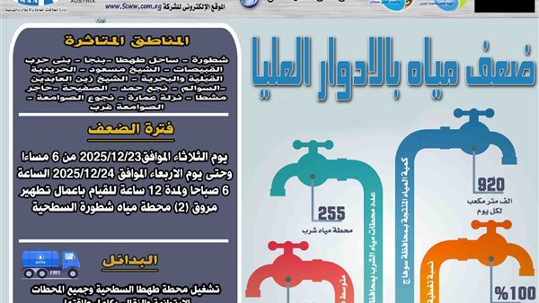 وأشارت إلى أن فترة الضعف تبدأ من الساعة السادسة مساء يوم الثلاثاء الموافق 23 ديسمبر 2025، وتستمر حتى الساعة السادسة صباح يوم الأربعاء الموافق 24 ديسمبر 2025، بمدة إجمالية تصل إلى 12 ساعة، وذلك لإجراء أعمال تطهير مروق (2) بمحطة مياه الشطورة السطحية.