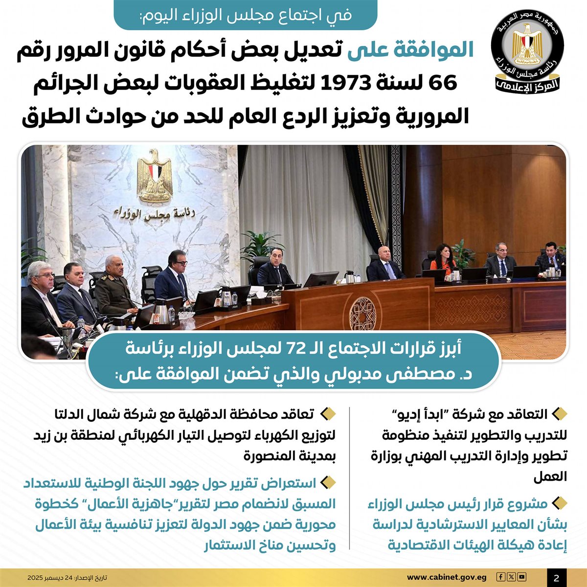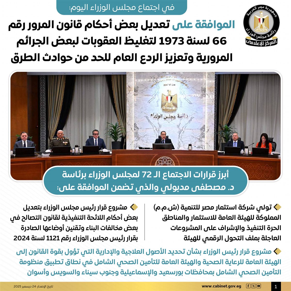 وافق مجلس الوزراء برئاسة الدكتور مصطفى مدبولي خلال اجتماعه في العاصمة الجدة اليوم الأربعاء، على مشروع تعديل بعض أحكام قانون المرور رقم 66 لسنة 1973، في خطوة تستهدف تشديد العقوبات على عدد من الجرائم المرورية الخطرة، وتعزيز الردع العام بما يسهم في الحد من حوادث الطرق وحماية أرواح المواطنين.