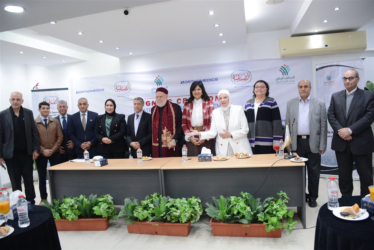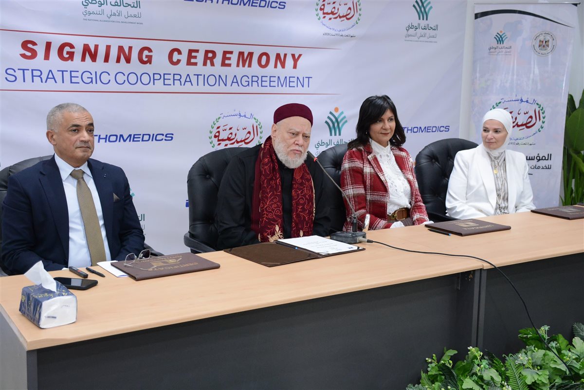 جرت مراسم التوقيع بحضور الإمام الدكتور علي جمعة، رئيس مجلس أمناء المؤسسة الصديقية، والسفيرة نبيلة مكرم رئيس الأمانة الفنية للتحالف الوطني، والدكتور خالد عبدالرحمن الديب، رئيس مجلس إدارة أورثوميدكس، وذلك في إطار توحيد جهود المجتمع المدني والقطاع الخاص لخدمة الفئات الأولى بالرعاية.