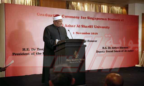 أناب الدكتور أحمد الطيب ، شيخ الأزهر، الدكتور عباس شومان ، وكيل الأزهر، في حضور الاحتفال بتخريج طلاب سنغافورة الدراسين في الأزهر، وذلك بحضور رئيس سنغافورة الدكتور توني تان.