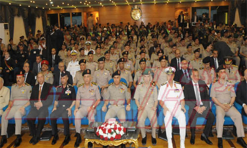 وأشار الى دور الاكاديمية فى تخريج قادة حملوا الامانة وسجلوا فى تاريخنا الوطنى والعسكرى بطولات وانتصارات تحفظها ذاكرة التاريخ واسهموا فى صنع تاريخ هذا الوطن واكدوا بعطائهم وتضحياتهم ان الجيش المصرى هو ركيزه القيم والمبادئ ومعانى الوطنية والشرف وانكار الذات مؤكدا ان القوات المسلحه قوات عصريه تمتلك من اسباب القوة مايمكنها من الوفاء بمهامها ومسئوليتها ويخطىء من لايعى قدر مصر وقواتها المسلحة والتى تمضى بكل قوة نحو تطوير امكانتها لرفع علم مصر خفاقا بين الامم والشعوب .