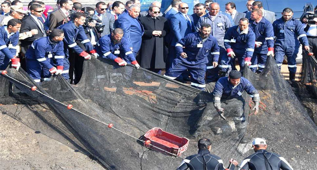 افتتح الرئيس عبدالفتاح السيسي، مشروع الاستزراع السمكي شرق قناة السويس، الذي يعد الأول بمصر من حيث الاستزراع البحري في المياه المالحة، وواحدًا من أكبر نماذج الاستزراع السمكي في العالم، حيث تشمل المرحلة الأولى التي تم الانتهاء منها 1029 حوضًا سمكيًّا، من إجمالي 4000 حوض سمكي بعد اكتمال مراحل المشاريع الثلاث، ومن المنتظر أن ينتج مليون طن أسماك سنويًا؛ بهدف سد فجوة الاستيراد التي تصل إلى 700 ألف طن سنويًّا، وتصدير الفائض للخارج؛ لتوفير العملة الصعبة، وإنتاج البروتين الحيواني، فضلًا عن توفير عشرة آلاف فرصة عمل مباشرة وغير مباشرة في كل المهن والتخصصات.