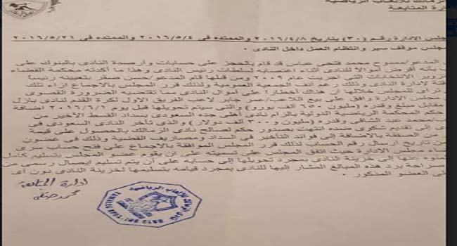 وكشف مجلس الإدارة عن وجود قرار رسمي من المجلس بالإجماع على فتح حساب شخصي بأسم أحد أعضاء مجلس الإدارة لتلقي الأموال الخاصة بالنادي بعد حصول ممدوح عباس رئيس النادي الأسبق على أرصدة النادي، وتم الاستقرار على فتح حساب خاص بهاني زادة عضو المجلس لتلقي الأموال التي تخص النادي من إعارة وبيع اللاعبين لأندية خارجية، مثلما حدث بعد بيع محمد عبد الشافي لأهلي جدة السعودي وإعارة كهربا لاتحاد جدة وإعارة مصطفى فتحي للتعاون السعودي خلال الفترة الماضية.