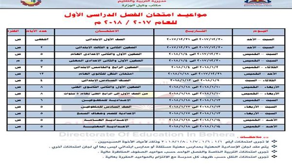تنفرد " بوابة روزاليوسف" بنشر مواعيد امتحانات الفصل الدراسى الأول بمحافظة البحيرة لكافة المراحل التعليمية لأبناء المحافظة، واليكم جدول يوضح مواعيد الامتحانات .