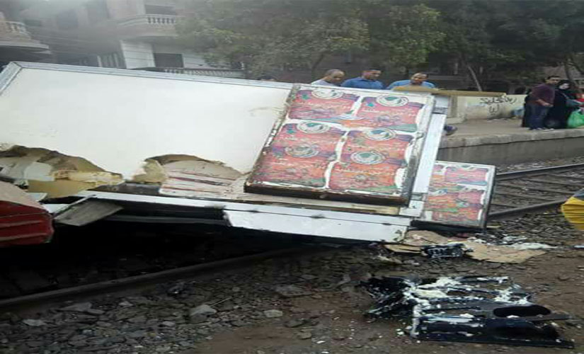 بالصور .. قطار يصطدم بسيارة حفظ أغذية بخط المنصورة
