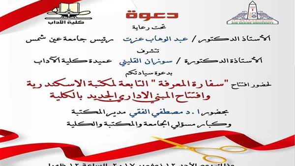 تستعد جامعة عين شمس تحت رعاية الدكتورة "سوزان القليني" عميد كلية الآداب لافتتاح قاعة سفارة المعرفة التابعة لمكتبة الإسكندرية. كما دعت الطلاب وأعضاء هيئة التدريس أيضا لحضور افتتاح المبنى الإداري الجديد بالكلية.