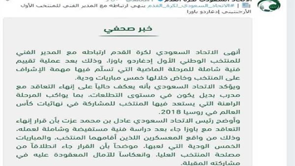 ونشر الاتحاد السعودي على موقع التدوينات القصيرة "تويتر" :يؤكد الاتحاد السعودي، بأنه يبحث حاليا على إنهاء التعاقد مع مدرب بديل يكون في مستوى التطلعات، بما يواكب المرحلة الراهنة التي يستعد فيها المنتخب للمشاركة في نهائيات كأس العالم في روسيا 2018.