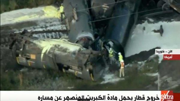 عرضت فضائية اكسترا نيوز، لقطات من خروج إحدى القطارات عن مساره في ولاية فلوريدا بأمريكا، والذي كان يحمل مادة الكبريت المنصهر.