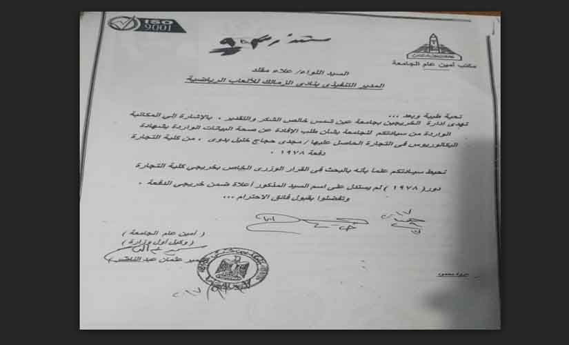 وجاء المستند الأول بتسليم العتال شهادته من جامعة عين شمس كلية التجارة (دور مايو 1978)، وهو ما اتضح تزويرها بعد الخطاب الذي أرسله النادي إلى الأمين العام للجامعة بتاريخ 17/9/2017، لطلب الإفادة بشأن مؤهله الدراسي.