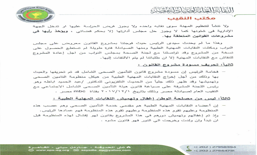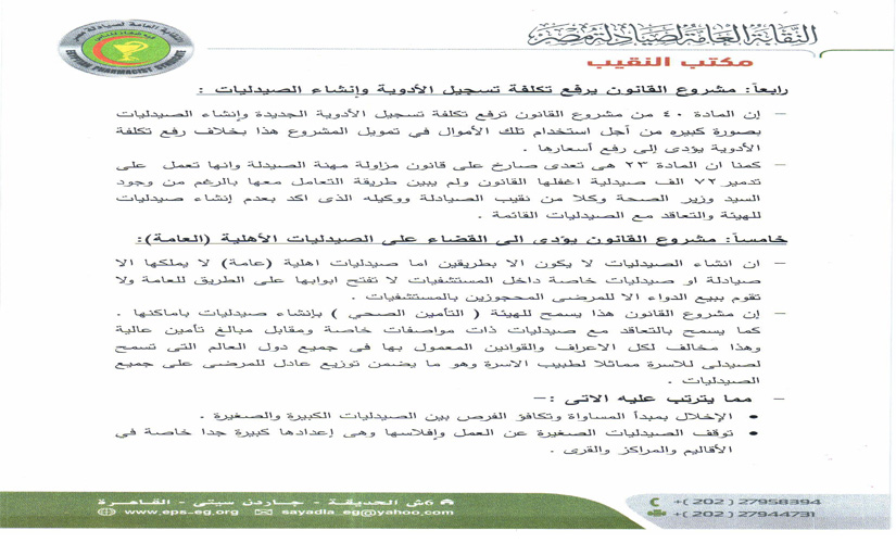 وأوضح نقيب الصيادلة فى المذكرة أن المادة 77 من الدستور تضمنت أن يؤخذ رأى النقابات المهنية فى مشروعات القوانين المتعلقة بها ، وهذا ما لم يحدث حيث فوجئنا بمشروع القانون معروض على مجلس النواب ومكثت النقابات المهنية الطبية ومنها الصيادلة فترة طويلة لم تستطع الحصول على نسخة من المشروع وقد تواصلنا مع لجنة الصحة بمجلس النواب من اجل إعادة المشروع للنقاش مع النقابات المهنية إلا ان طلباتنا لم يتم الالتفات إليها..