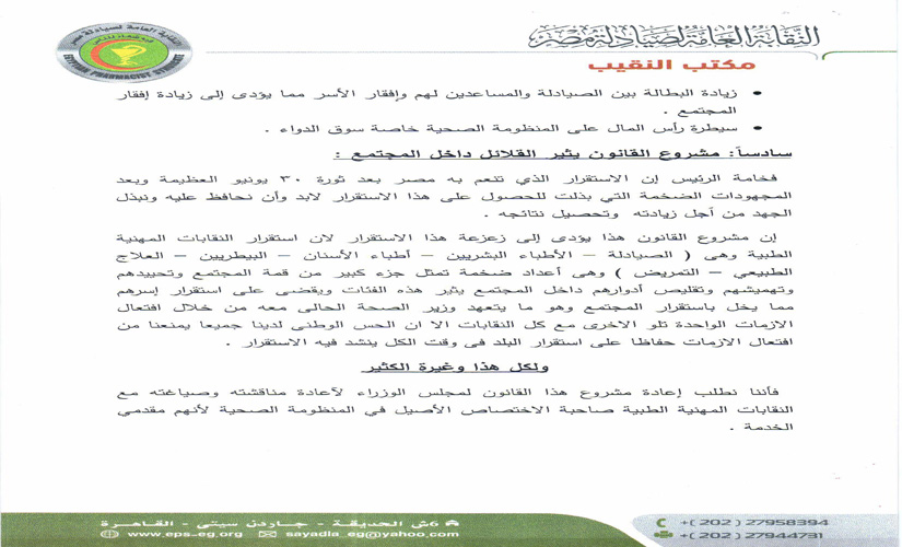 وأشار إلى أن مشروع القانون يثير القلاقل داخل المجتمع حيث إنه يؤدى إلى زعزعة استقرار النقابات المهنية الطبية والتى تضم ( الصيادلة – الأطباء البشريين – أطباء الأسنان – البيطريين – العلاج الطبيعي – التمريض ) وهى أعداد ضخمة تمثل جزء كبير من قمة المجتمع وتحييدهم وتهميشهم وتقليص أدوارهم داخل المجتمع يثير هذه الفئات ويقضى على استقرار إسرهم مما يخل باستقرار المجتمع ، الا ان الحس الوطنى لدينا جميعا يمنعنا من افتعال الازمات حفاظا على استقرار البلد فى وقت الكل ينشد فيه الاستقرار.