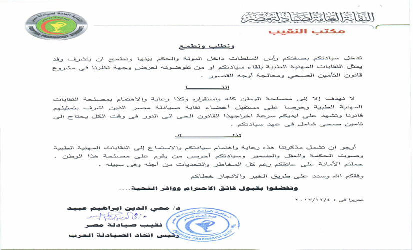 أرسل الدكتور محى عبيد نقيب الصيادلة مذكرة إلى رئيس الجمهورية عبدالفتاح السيسى ، تضمنت أوجه القصور الموجودة فى مشروع قانون التأمين الصحى ، مطالباً بمقابلة وفد يمثل النقابات المهنية الطبية للرئيس أو من يفوضه لعرض وجهة النظر في مشروع قانون التأمين الصحي ومعالجة أوجه القصور .