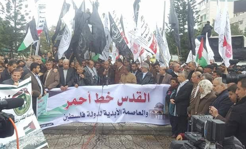 نشرت وكالة الأنباء الفلسطينية "وفا" صورًا لوقفة سلمية نظمتها فصائل العمل الفسلطينية ضد قرار ترامب بنقل السفارة للقدس، واعتبار القدس عاصمة إسرائيل.