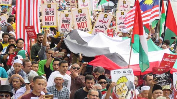 تظاهر أكثر من ألف ماليزي اليوم أمام مقر السفارة الأمريكية بالعاصمة كوالالمبور ضد قرار الرئيس الأمريكي دونالد ترامب الاعتراف بالقدس عاصمة لإسرائيل.
