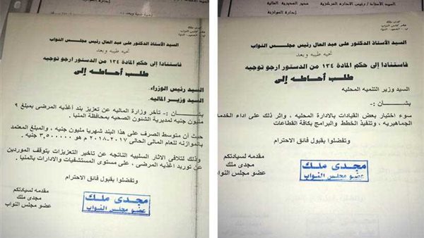 تقدم النائب مجدى ملك عضو مجلس النواب عن حزب المصريين الأحرار، بطلب إحاطة إلى الدكتور علي عبد العال رئيس مجلس النواب، موجه إلى رئيس الوزراء ووزير المالية، بشأن تأخر وزارة المالية عن تعزيز بند أغذية المرضى بمبلغ 9 مليون جنية لمديرية الشؤون الصحية بمحافظة المنيا.