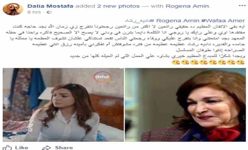 وقالت داليا، للفنانة روجينا في منشور على صفحتها الخاصة: «ايه بقي الاتقان العظيم ده حقيقي رائعين..لا اكتر من رائعين.. رجعتونا نتفرج زي زمان..الله بجد حاجه كنت مفتقدها اوي.. وعلي رايك يا روجي انا الكلمة دايما بترن في ودني لا يصح الا الصحيح.. فاكره واحنا في حفله المعهد.. بجد امتعتني وانا بتفرج عليكي..ووفاء رجعتي الناس تقعد تستناكي علشان تشوف العظمه يا ممثله يا جامده..والقديره ناديه رشاد عظيمه عظيمه..من فتره مشوفتش أم تفكرني بأمينه رزق انتي عظيمه..الصراحه إنتوا طوفان المسلسل وبجدا شكرًا للمبدع العظيم خيري بشاره علي العمل اللي لم العيله كلها من جديد».