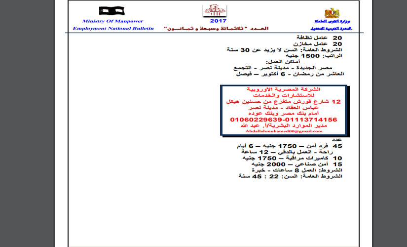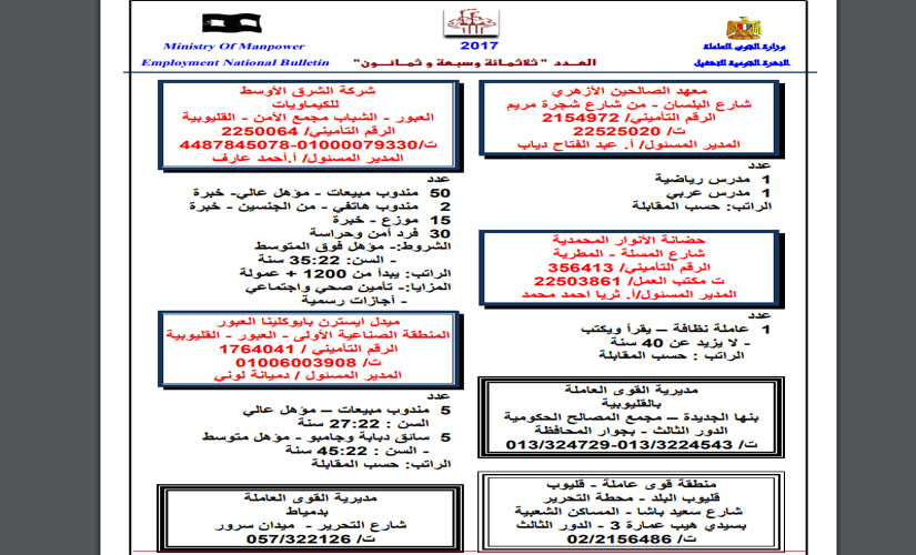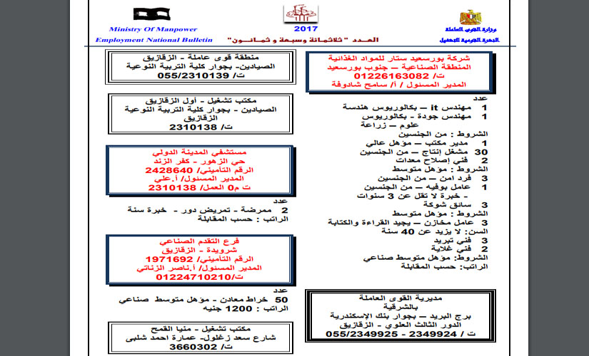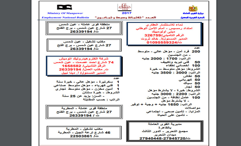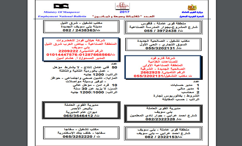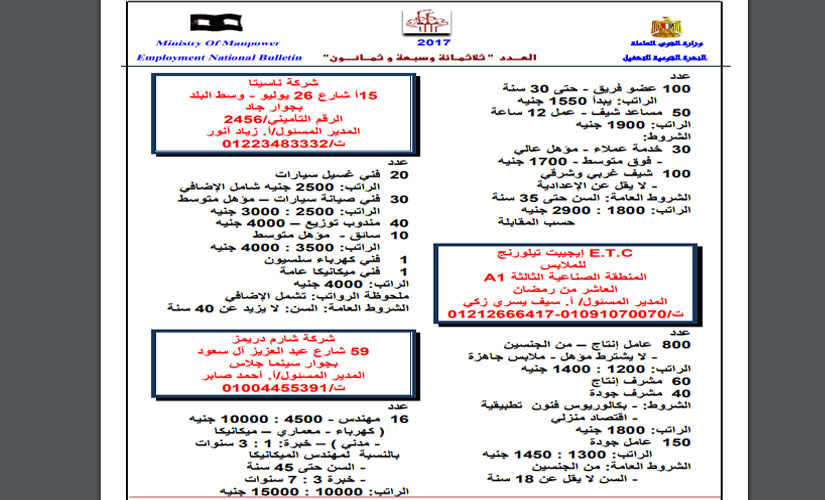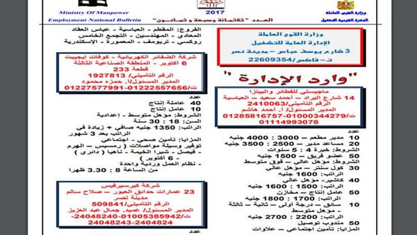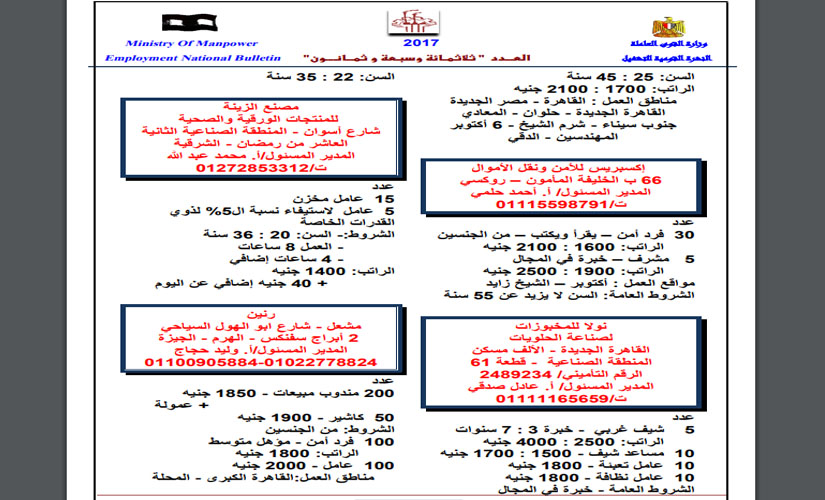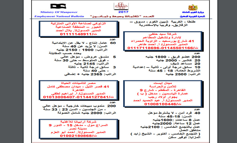 أعلنت وزارة القوى العاملة، توفير 5342 فرصة عمل متوفرة حتى نهاية شهر يناير 2018، وفقا للنشرة القومية للتشغيل