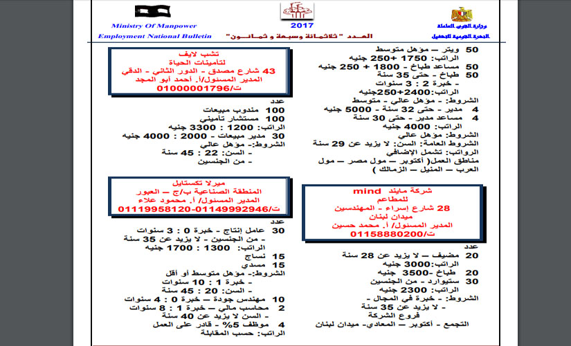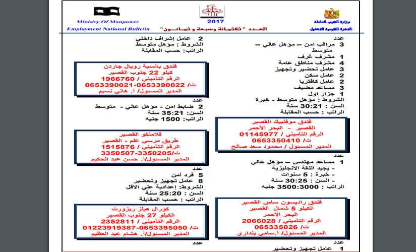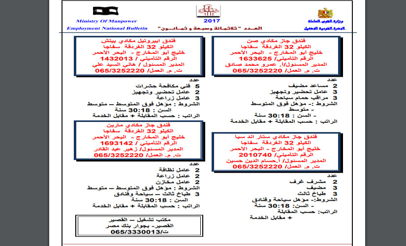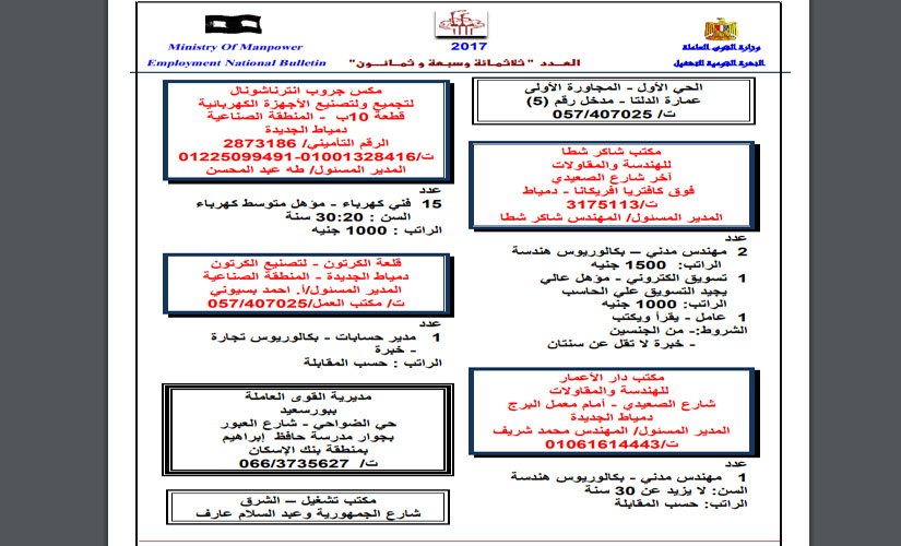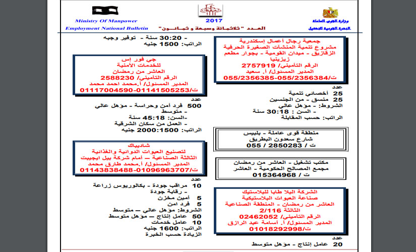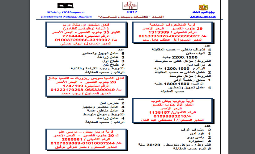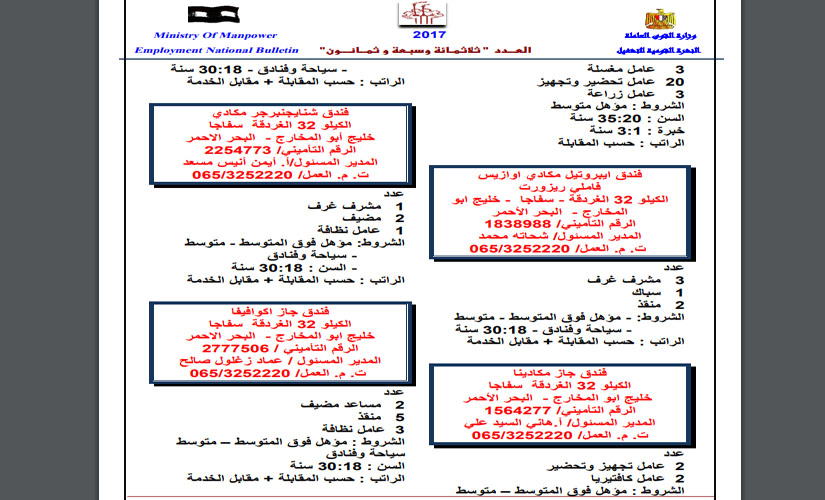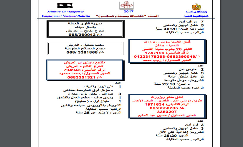 أعلنت وزارة القوى العاملة، توفير 5342 فرصة عمل متوفرة حتى نهاية شهر يناير 2018، وفقا للنشرة القومية للتشغيل