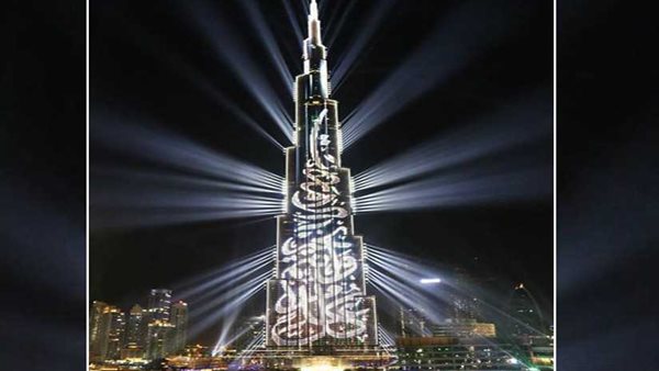 حمل الجسم الخارجي للبرج ألوان العلم الإماراتي، وعبارات التهنئة بالعام الجديد، باللغتين العربية والإنجليزية، وصورة الشيخ زايد احتفالا بتسمية العام الجديد 2018 (عام زايد).