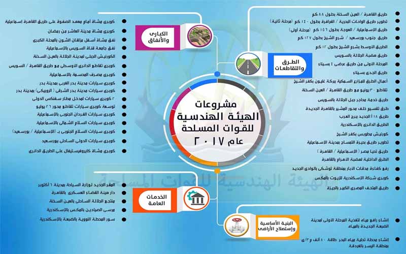 وتضمن الانفوجراف مشروعات الهيئة الهندسية فى العديد من القطاعات مثل الإسكان والطرق والكبارى والمدن الجديدة.