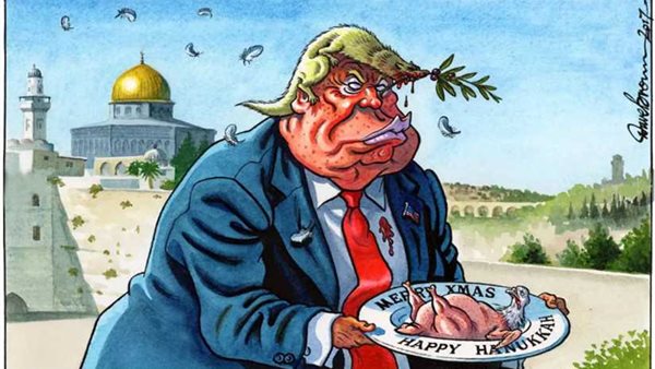معترضا علي قراره الأخرق بالإعتراف من جانب واحد بالقدس كعاصمة لإسرائيل في الكاريكاتير المنشور بجريدة الإندبندنت البريطانية الشهيرة.