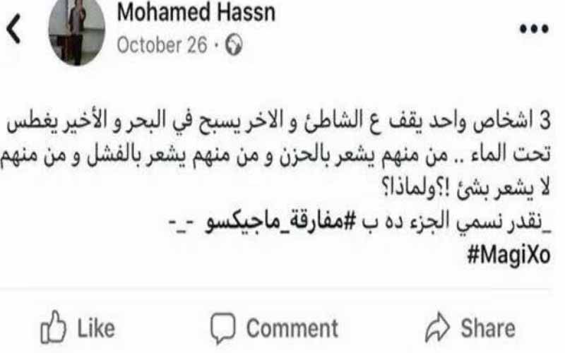 وتحمل العبارات الأدبية القصيرة ذات المعاني الغامضة التي تعود على نشرها من آن لآخر على صفحته الخاصة عبر موقع التواصل الاجتماعي "فيس بوك" كثير من الغموض، وأصبحت مثار حديث المواطنين حاليا، حيث يسعون للاطلاع عليها وتحليلها، فبعد سقوط الشاب في البحر بساعات بدأ رواد موقع "فيس بوك" بالبحث عن صفحته الشخصية والاهتمام بمنشوراته والدعاء له بالنجاة من ظلمات البحر.