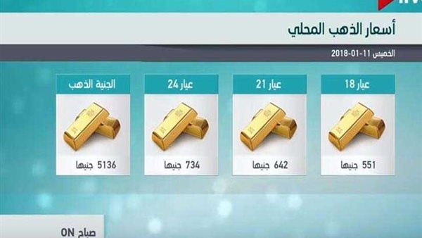 قدم برنامج "صباح ON" على قناة "On live"، خدمة للمشاهدين تهدف إلى إمدادهم واطلاعهم بشكل مستمر على أسعار الذهب، ومتابعة عمليات الارتفاع والانخفاض التى يتعرض لها بشكل يومى، وإليكم قائمة بأسعار الذهب اليوم الخميس 11 يناير 2018