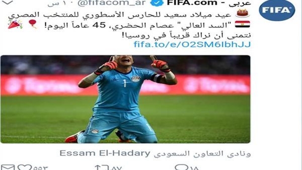 وكتب الحساب الرسمي للفيفا عبر موقع التدوينات القصيرة "تويتر": "عيد ميلاد سعيد للحارس الأسطوري للمنتخب المصري السد العالي عصام الحضري، 45 عامًا اليوم، نتمنى أن نراك قريبًا في روسيا".