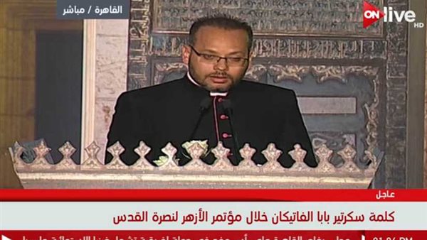 ألقى سكرتير البابا فرانسيس، بابا الفاتيكان، رسالته إلى الإمام الأكبر الدكتور أحمد الطيب، شيخ الأزهر، حيث قدم الشكر له لدعوته لحضور مؤتمر الأزهر العالمي لنصرة القدس، معربًا عن تقديره له.