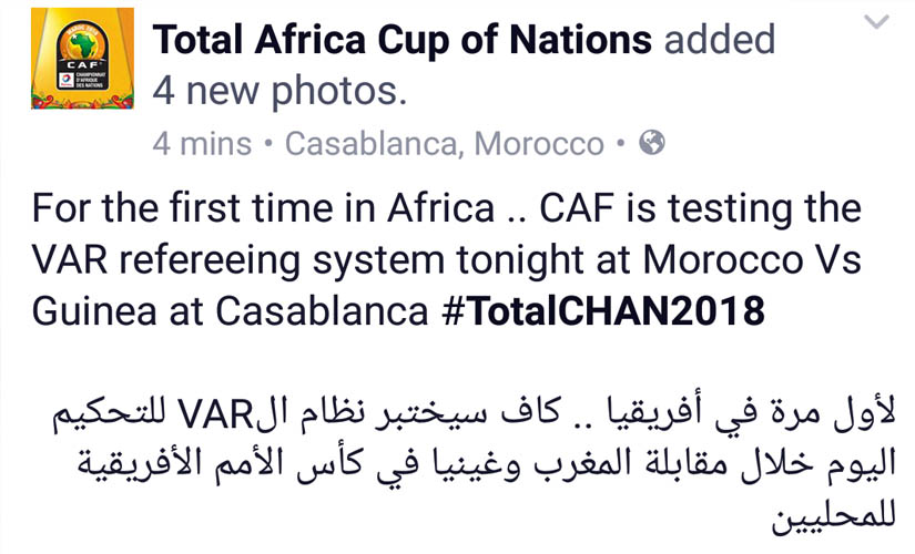 وكتب "كاف" على صفحته الرسمية عبر موقع التواصل الإجتماعي"فيس بوك" : لأول مرة في افريقيا .. كاف سيختبر نظام var للتحكيم اليوم خلال مقابلة المغرب وغينيا في كأس الأمم الإفريقية للمحليين.