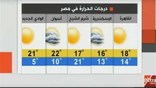 استعرض برنامج «هذا الصباح»، المذاع عبر فضائية «اكسترا نيوز»، اليوم الأربعاء، النشرة الجوية، ويتوقع خبراء هيئة الأرصاد الجوية أن يسود البلاد اليوم طقس بارد شمالاً حتى الوجه البحرى والقاهرة معتدل جنوبًا نهارًا شديد البرودة ليلاً، كما يتكون الصقيع على المزروعات فى وسط سيناء، والرياح أغلبها شمالية غربية معتدلة تنشط على البحر المتوسط غربًا، مما يؤدى إلى اضطراب الملاحة البحرية هناك.