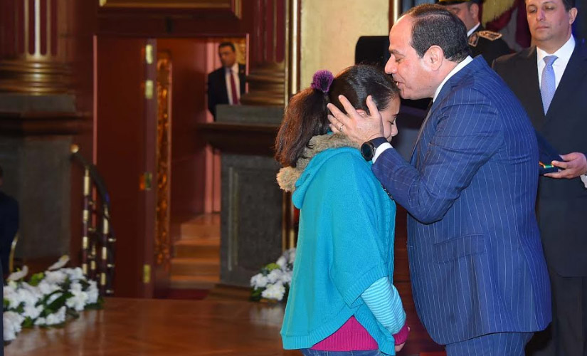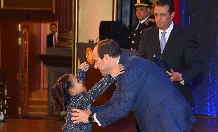 وصعدت الطفلة على مسرح أكاديمية الشرطة، وهي تبكي، ما دفع السيسي إلى احتضانها ومسح دموعها، والشد من أزرها.
