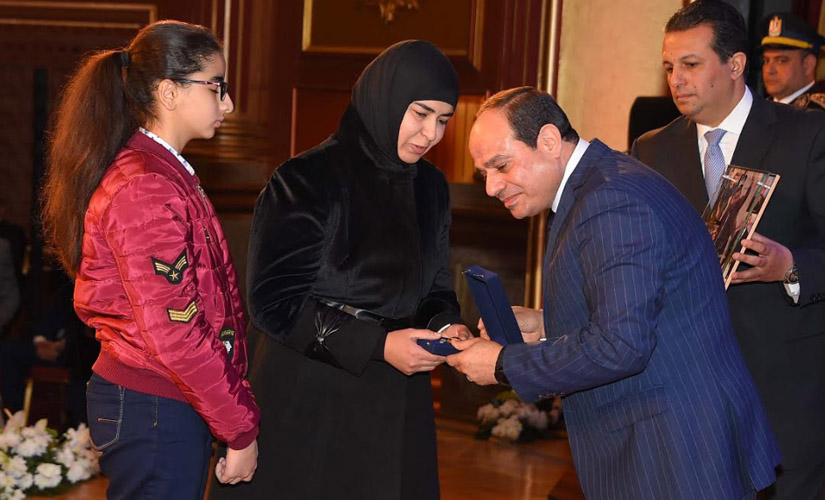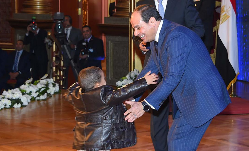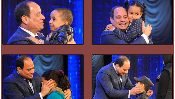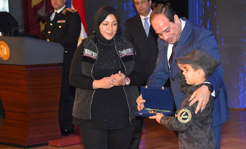 حيث احتضن السيسي، ابنه أحد شهداء الشرطة الأبطال، وذلك أثناء منحه لأسر شهداء الشرطة أوسمة الجمهورية والاستحقاق، وتكريمه لهم في احتفالية عيد الشرطة السادس والستين.