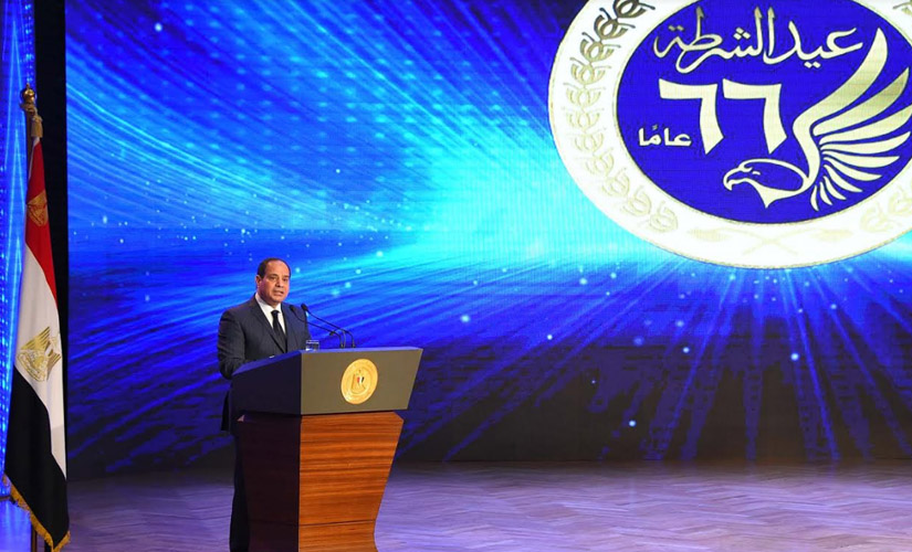 كما وجه الرئيس التحية لرجال الشرطة مشيدًا بجهودهم لتحقيق الأمن في مصر، وتقدم كذلك بالتحية للشعب المصري بمناسبة ذكرى ثورة ٢٥ يناير، وأوضح الرئيس أن هناك الكثير من الأخطار تحيط بالوطن، مؤكدًا أهمية الحفاظ على الوحدة والهدف، وعدم السماح بتغيير بوصلة العمل الوطني وتقويض الجهود التي تتم لحماية الوطن من الأخطار، مشيرًا إلى أن هناك من يريدون النيل من مصر وتغيير اتجاهها من العمل والبناء والتنمية والتعمير، مشددًا في الوقت ذاته على أنه لن يمكن النيل من مصر طالما ظل هناك اصطفاف وطني ووحدة في صفوف الشعب. وفيما يلي نص كلمة الرئيس السيسي :