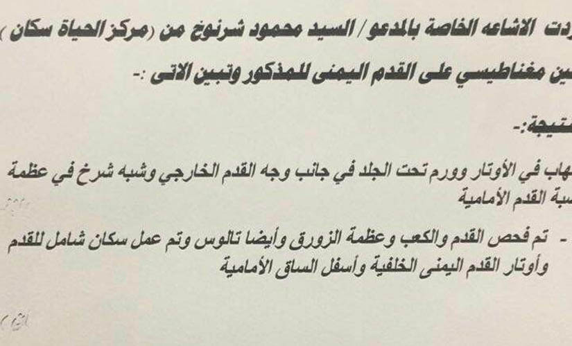 وقال تقرير الطب الشرعي: إن سيد محمود شرنوخ مخلوف مصاب بتمزق في أربطة القدم اليمني واشتباه في شروخ.