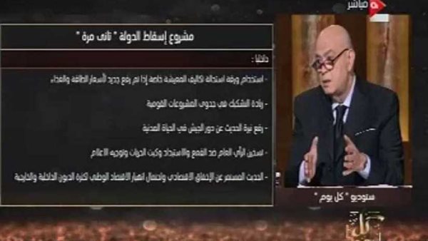 كشف الإعلامى عماد الدين أديب، عن تفاصيل مخطط إسقاط الدولة، مشيراً إلى أن أول أهداف المخطط، هو استخدام ورقة استحالة المعيشة، خاصة إذا تم رفع جديد لأسعار الطاقة والغذاء.