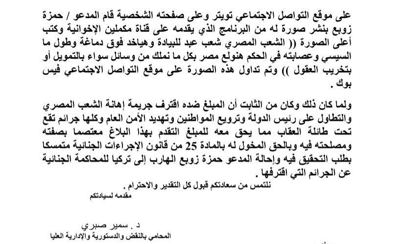 وتم تداول هذه الصورة على موقع التواصل الاجتماعي فيس بوك، ولما كان ذلك وكان من الثابت أن المبلغ ضده اقترف جريمة إهانة الشعب المصري والتطاول على رئيس الدولة وترويع المواطنين وتهديد الأمن العام وكلها جرائم تقع تحت طائلة العقاب، وطلب صبري تحقيق الواقعة وإحالة المدعو حمزة زوبع الهارب إلى تركيا للمحاكمة الجنائية عن الجرائم التي اقترفها وقدم صبري حافظة مستندات مؤيدة لبلاغه.