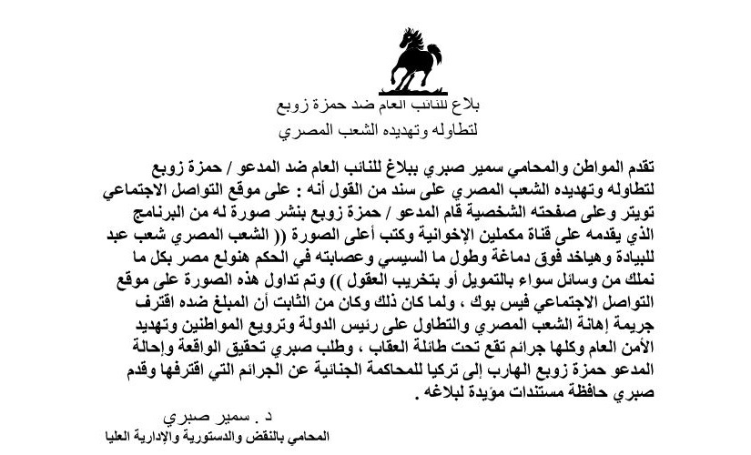 تقدم المحامي سمير صبري ببلاغ للنائب العام ضد المدعو حمزة زوبع لتطاوله وتهديده الشعب المصري على سند من القول إنه: على موقع التواصل الاجتماعي تويتر وعلى صفحته الشخصية قام المدعو حمزة زوبع بنشر صورة له من البرنامج الذي يقدمه على قناة مكملين الإخوانية وكتب أعلى الصورة "الشعب المصري شعب عبد للبيادة وهياخد فوق دماغه وطول ما السيسي وعصابته في الحكم هنولع مصر بكل ما نملك من وسائل سواء بالتمويل أو بتخريب العقول".