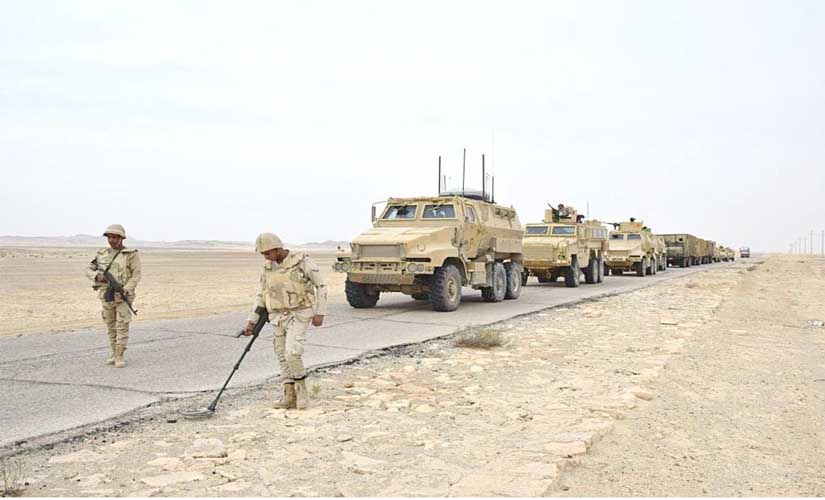 فيما واصلت عناصر القوات البحرية تنفيذ مهامها المخططة وإبرار المجموعات القتالية لعناصر الوحدات الخاصة البحرية من حاملة المروحيات "المسترال " لتنفيذ أعمال التمشيط بمنطقة ساحل العريش ، بالتزامن مع قيام عناصر حرس الحدود والشرطة أعمالها بتكثيف إجراءات تأمين الأهداف الحيوية والمرافق العامة وتنظيم الكمائن الثابتة والمتحركة وتنفيذ أعمال التمشيط بمناطق مكافحة النشاط الإرهابى بالظهير الصحراوى فى صعيد مصر ، وعلى الطرق والمدقات والدروب الجبلية على الإتجاهات الحدودية الجنوبية والغربية لإحباط أى محاولة لإختراق الحدود الدولية .
