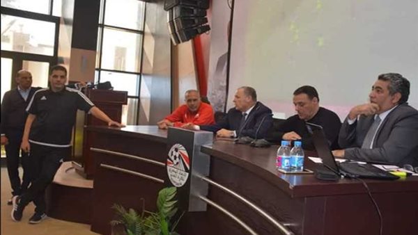 توجه المهندس هانى ابو ريدة رئيس الاتحاد والمهندس احمد مجاهد عضو مجلس الادارة لقاعة المؤتمرات بمبنى الاتحاد بالجزيرة اثناء انعقاد التحليل الفنى لاداء الحكام فى المرحلة الاخيرة للدورى الممتاز بحضور الكابتن عصام عبد الفتاح والكابتن وجيه احمد والدكتور عزب حجاج ..والمسئولون عن التحليل الكابتن جمال الغندور والكابتن احمد الشناوى والكابتن سيد مراد والكابتن مجدى رزق والكابتن احمد ابو العلا