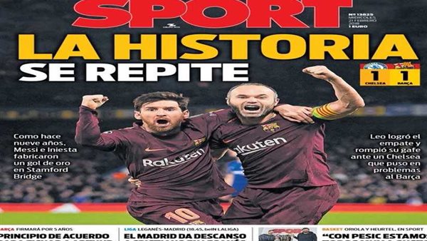 كما احتفلت فيه الصحافة الإسبانية بتعادل برشلونة مع تشيلسى بنتيجة 1/1، حيث جاء فى عنوان صحيفة "سبورت"، " التاريخ يعيد نفسه.. قبل سنوات ميسي صنع هدفاً لإنييستا في ستامفورد بريدج ، والآن إنييستا يرد الجميل ويصنع أول هدف لميسي على أرض ستامفورد بريدج فى لندن"