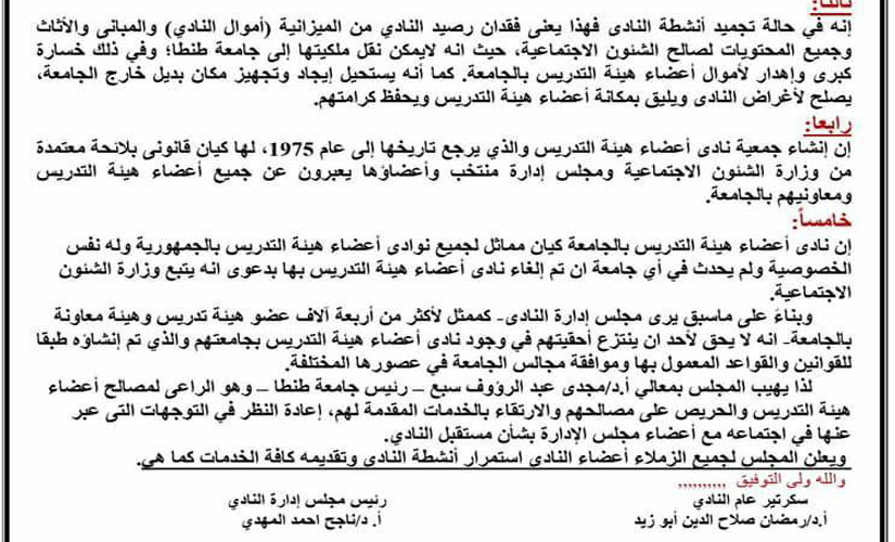 وأفرد البيان تاريخ وتأصيل قرار تخصيص أرض النادي، الذي أقيم بأمواله وأصبح خاضعا لإشراف مديرية الشؤون الاجتماعية، وفى حال إلغاء النادي سوف تؤول أمواله وممتلكات أعضاء هيئة التدريس للشؤون الاجتماعية وليس لجامعة طنطا، وفى ذلك إهدارا لأموال الأساتذة والمدرسين والمعيدين.