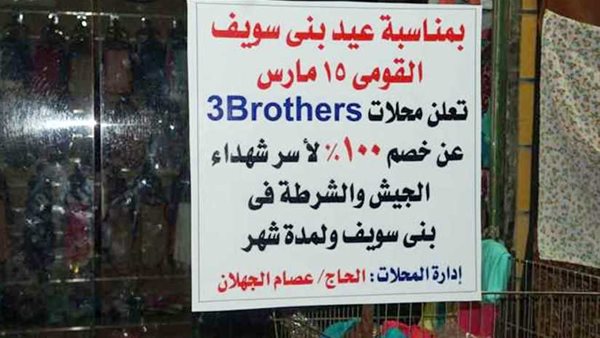 فوجئ رواد شارع المنطقة التجارية "الأباصيري" بمدينة بني سويف بصاحب محال "طرح وعبايات" يضع إعلانا على مدخله بخصم 100% لأسر الشهداء من الجيش والشرطة في بني سويف لمدة شهر بمناسبة احتفال المحافظة بالعيد القومي 15 مارس الجاري.