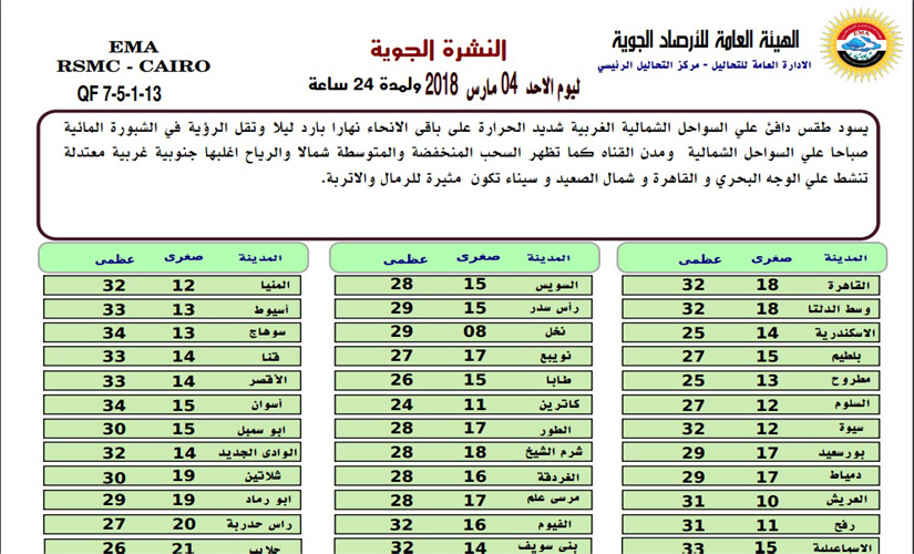 أما عن درجات الحرارة المتوقعة غدا الأحد 4 مارس 2018 فكالآتي: