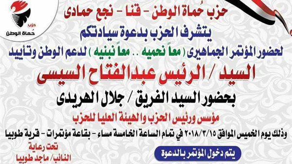 أعلن المتحدث الإعلامي لحزب حماة الوطن بقنا، أيمن الوكيل عن تنظيم الحزب لمؤتمر جماهيري تحت عنوان "معًا نحميه، معًا نبنيه" لدعم الوطن، وتأييد السيد الرئيس عبد الفتاح السيسي، بحضور الفريق جلال الهريدي، مؤسس ورئيس الحزب، والهيئة العليا للحزب وذلك يوم الخميس القادم 15 مارس بقاعة المؤتمرات، بقرية طوبيا، بنجع حمادي، برعاية النائب، ماجد طوبيا، عضو مجلس النواب عن حزب حماة الوطن.